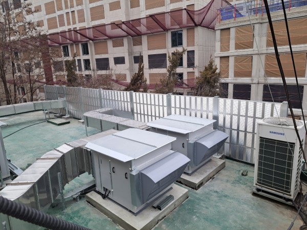 급식실 건물 건너편 공조설비 소음피해를 방지하기 위하여 방음벽 설치를 하였다.