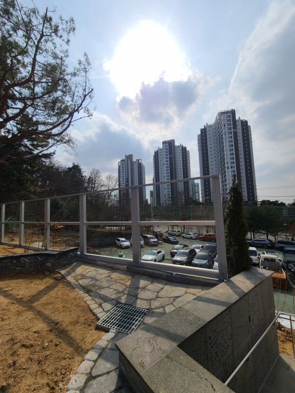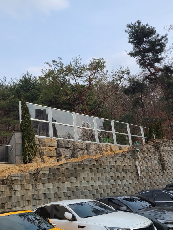 건물 건너편 차량소음으로 인해 투명방음벽을 설치하여 소음피해를 줄였다.