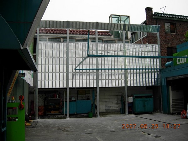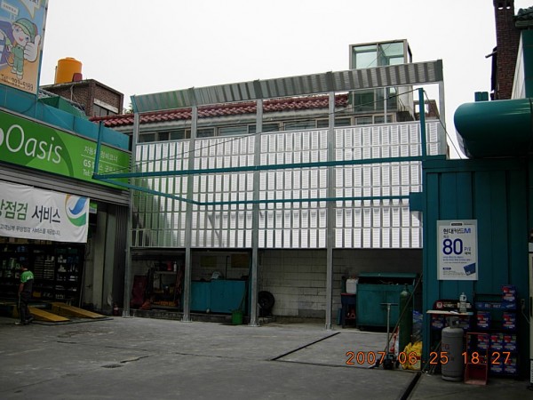 내 용 : 주유소 자동세차장과 정비소에서 발생하는 소음으로 인하여 민원이 발생,이에 AL방음판을 6.5m의 높이로 설치하여 민원을 해결하였다.