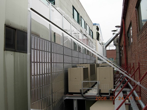 내 용 : 옥외 실외기 설치에 따른 옆공장의 소음피해가있어 일부구간 AL방음판으로 차음과 흡음을 시키고, 옆공장 창문부분 구간은 투명방음판을 설치하여 햇빛차단을 최소화하였다