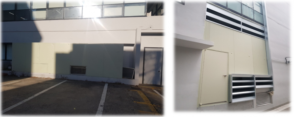 3군데(1층주차장, 1층건물측면, 옥상)에 설치된 실외기때문에 인접한 빌라에서 소음피해가 발생하여 방음판넬, 소음기, 방화문, 개패도어, 방음벽 등 상황에 맞게 설치하여 민원을 해결하였다.