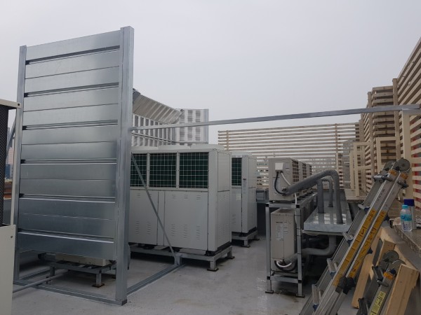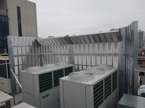 옥상에 설치된 냉동시설 실외기때문에 인접한 빌라에 소음피해가 발생하여 방음벽을 설치하여 민원을 해결하였다.