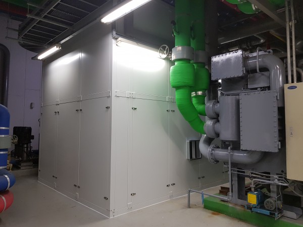 내 용 : 기계실 펌프모터 가동시 발생되는 소음을 감소시키기 위해 ENCLOSURE, 급기소음기, 배기소음기를 제작 및 설치하여 환경을 개선시킴.