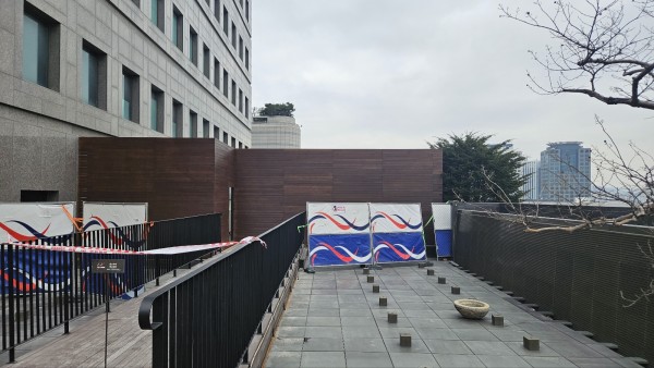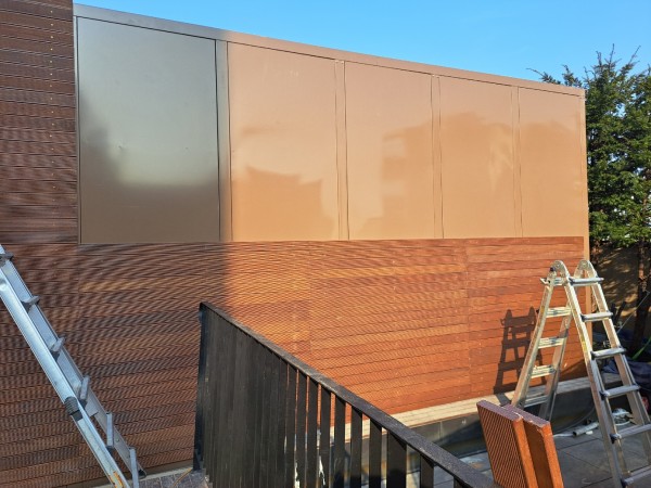 백화점 옥상에 설치되어있는 각종 기계설비 소음을 감소시키기 위해 방음벽을 설치하고 미관을 위해 방음벽 바깥부분 목재작업을 하였다.